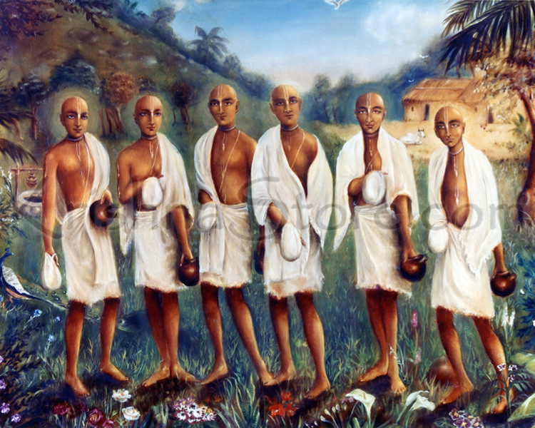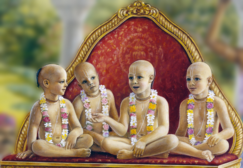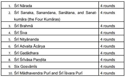 Now I will tell you about a powerful sequence of meditation to apply to your chanting. Even if you have already been chanting for a while, if you follow this sequence you will notice a definite improvement. First, chant four rounds while meditating that you are sitting at the lotus feet of your Śrīla Gurudeva. Feel that you are very close to him, and that he is listening to your chanting and is very pleased. In this way, continue chanting sets of four rounds while meditating on sitting at the lotus feet of the transcendental personalities as listed below.